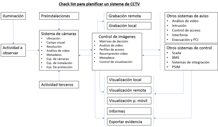 Al planificar un sistema de CCTV podemos utilizar un listado de comprobación, para segurar la calidad de la planificación del sistema de CCTV. A continuación se incluye un diagrama que utilizamos para la planificación de los sistemas de CCTV.