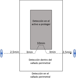 Del sistema de seguridad, se espera un tiempo de evaluación del aviso y llamada a policia de 3min, y un tiempo de respuesta de policia de 12min. El activo dispone de un sistema de detección bien instalado, con una probabilidad de detección del 90%. Para el anillo de detección exterior, se debe decidir entre: