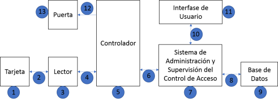 El analisis debe realizarse en cada una de las etapas del control de accesos, desde la identificación hasta la orden de apertura de la puerta. En el siguiente diagrama se muestran todas las etapas y se hace referencia a los puntos en los que debe analizarse la vulnerabilidad.